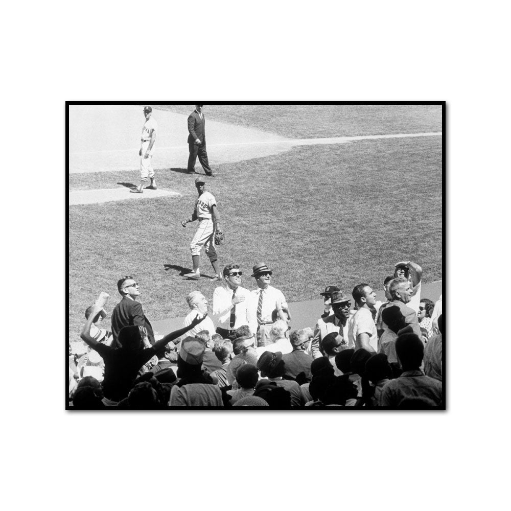 President John F. Kennedy Attends the 1962 All Star Baseball Game at DC Stadium, 7/10/1962. Photograph by Cecil Stoughton. We have adapted a copy of the original photo to elegantly display on the artblock product.